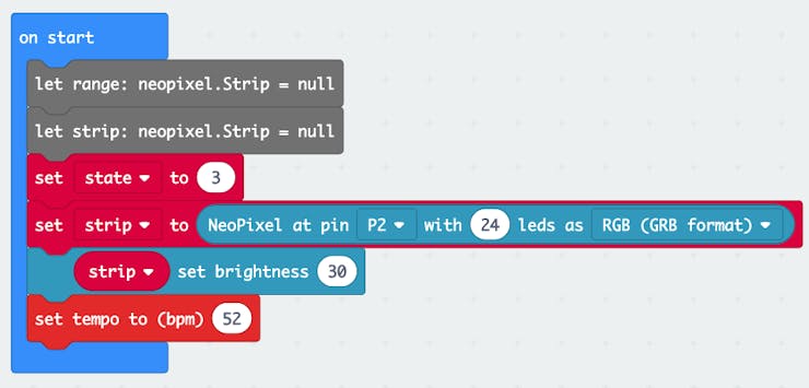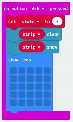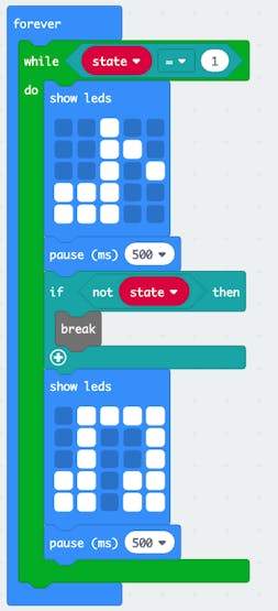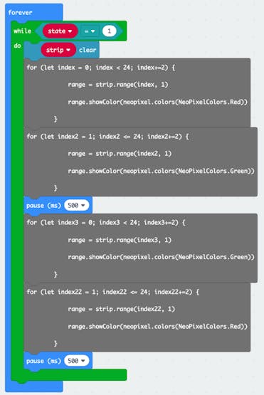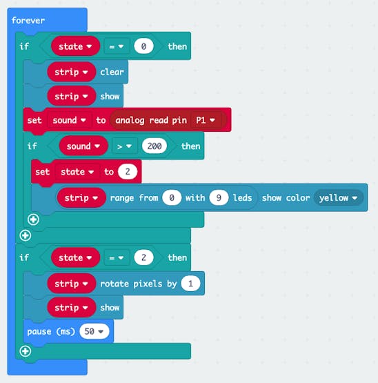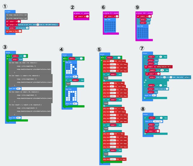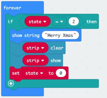 【12 DAYS OF TECHMAS 】 Christmas Ornament-圣诞节装饰品 ![]() On the first day of Christmas, my true love gave to me a partridge in a pear tree On the second day of Christmas, my true love gave to me two turtledoves and a partridge in a pear tree ········· 一首12days of Christmas送给这个圣诞节。祝福的音乐响起来了, 空气里处处洋溢着暖心的声音,宣告着圣诞节也已经来到身边。 micro:bit RGB 全彩LED灯环扩展板做的圣诞节饰品 我们的一个日本用户利用micro:bit RGB 全彩LED灯环扩展板制作了一件装饰品。 整个过程花费数个小时。 ![]() 按下A按钮后,圣诞装饰品会播放歌曲并呈现彩色符号,其中歌曲通过micro:bit RGB 全彩LED灯环扩展板的蜂鸣器播放,符号则通过红绿光矩阵演示。 按下B按钮可进入K歌模式。我使用了带扩展板的麦克风。当检测到声音时,麦克风发出黄光, "Merry Xmas"会在屏幕上显示。 MakeCode 使用了MakeCode进行编码。 MakeCode模块 以下是这个圣诞装饰物的模块: ![]() 变量 ![]() 变量、输入引脚、单元数和亮度的初始化模块,以用于指定的回放旋律。 A模式 按下A按钮,执行此模式。 2.按钮检测 ![]() 按下A按钮,变量状态将设置为1。 3.照明设定 ![]() 当变量状态为1时(按下A按钮),扩展板会交替重复闪烁红/绿光。 4. LED矩阵设置 ![]() 当变量状态为1时(按下A按钮),两个音符在micro:bit上交替显示。 5. 音频播放 当变量状态为1时(按下A按钮),通过扩展板蜂鸣器重复播放这些歌曲。当变量状态变为非1的其它数值时,蜂鸣器将退出循环,并停止播放声音。 B模式 按下B按钮时执行此操作。 6. B按钮检测 按下B键,变量状态将设置为0,并重置矩阵显示。 7. 声音检测 ![]() 重置扩展板,并打开MIC检测功能。 当通过MIC检测到声音(模拟值超过200)时,将变量状态设置为2,并亮起9个黄灯。 当变量状态为2时(在语音检测时),它将旋转显示9个黄灯。 8. LED矩阵设置 当变量状态为2时(当检测到语音时),字符串将显示在矩阵中。 当显示完成时,可变状态设置为0,并等待语音检测。 ![]() 9.重置 同时按下A按钮和B按钮进行复位,LED矩阵将停止运行。 ![]() 代码: [mw_shl_code=applescript,true]let sound = 0 let state = 0 input.onButtonPressed(Button.A, function () { state = 1 }) input.onButtonPressed(Button.B, function () { state = 0 basic.showLeds(` . . . . . . . . . . . . . . . . . . . . . . . . . `) }) input.onButtonPressed(Button.AB, function () { state = 3 strip.clear() strip.show() basic.showLeds(` . . . . . . . . . . . . . . . . . . . . . . . . . `) }) let range: neopixel.Strip = null let strip: neopixel.Strip = null state = 3 strip = neopixel.create(DigitalPin.P2, 24, NeoPixelMode.RGB) strip.setBrightness(30) music.setTempo(52) basic.forever(function () { while (state == 1) { strip.clear() for (let index = 0; index < 24; index+=2) { range = strip.range(index, 1) range.showColor(neopixel.colors(NeoPixelColors.Red)) } for (let index2 = 1; index2 <= 24; index2+=2) { range = strip.range(index2, 1) range.showColor(neopixel.colors(NeoPixelColors.Green)) } basic.pause(500) for (let index3 = 0; index3 < 24; index3+=2) { range = strip.range(index3, 1) range.showColor(neopixel.colors(NeoPixelColors.Green)) } for (let index22 = 1; index22 <= 24; index22+=2) { range = strip.range(index22, 1) range.showColor(neopixel.colors(NeoPixelColors.Red)) } basic.pause(500) } }) basic.forever(function () { while (state == 1) { basic.showLeds(` . . # . . . . # # . . . # . # # # # . . # # # . . `) basic.pause(500) if (!(state)) { break } basic.showLeds(` . # # # # . # . . # . # . . # # # . # # # # . # # `) basic.pause(500) } }) basic.forever(function () { while (state == 1) { music.playTone(196, music.beat(BeatFraction.Quarter)) music.playTone(330, music.beat(BeatFraction.Quarter)) music.playTone(294, music.beat(BeatFraction.Quarter)) music.playTone(262, music.beat(BeatFraction.Quarter)) if (!(state)) { break } music.playTone(196, music.beat(BeatFraction.Whole)) music.playTone(196, music.beat(BeatFraction.Quarter)) music.playTone(330, music.beat(BeatFraction.Quarter)) music.playTone(294, music.beat(BeatFraction.Quarter)) music.playTone(262, music.beat(BeatFraction.Quarter)) if (!(state)) { break } music.playTone(220, music.beat(BeatFraction.Whole)) music.playTone(220, music.beat(BeatFraction.Quarter)) music.playTone(349, music.beat(BeatFraction.Quarter)) music.playTone(330, music.beat(BeatFraction.Quarter)) music.playTone(294, music.beat(BeatFraction.Quarter)) if (!(state)) { break } music.playTone(247, music.beat(BeatFraction.Whole)) music.playTone(392, music.beat(BeatFraction.Quarter)) music.playTone(392, music.beat(BeatFraction.Quarter)) music.playTone(349, music.beat(BeatFraction.Quarter)) music.playTone(294, music.beat(BeatFraction.Quarter)) if (!(state)) { break } music.playTone(330, music.beat(BeatFraction.Whole)) } }) basic.forever(function () { if (state == 0) { strip.clear() strip.show() sound = pins.analogReadPin(AnalogPin.P1) if (sound > 200) { state = 2 strip.range(0, 9).showColor(neopixel.colors(NeoPixelColors.Yellow)) } } if (state == 2) { strip.rotate(1) strip.show() basic.pause(50) } }) basic.forever(function () { if (state == 2) { basic.showString("Merry Xmas") strip.clear() strip.show() state = 0 } }) [/mw_shl_code] 运行 用该饰品装扮圣诞树可点缀节日气氛,非常可爱。 |