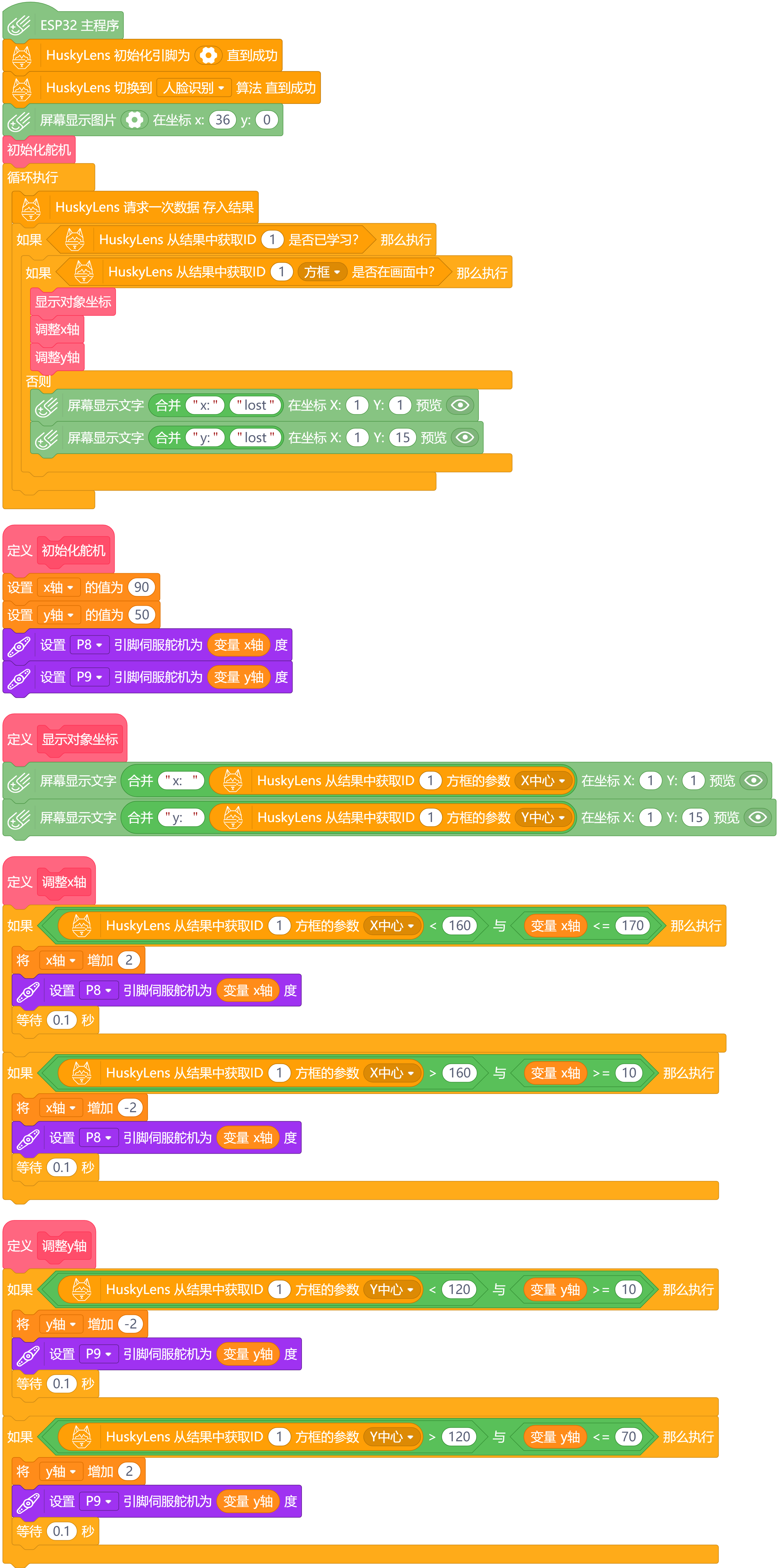 依次录入第二、第三个人脸信息 程序设计先说说思路 哈士奇的屏幕分辨率为320*240, 程序设计如下 试炼钛合金狗眼不废话,直接关门放二哈 上个测试视频 小结与市面上其他人工智能摄像头相比,HuskyLens自带屏幕,设置、学习等操作都可以直接在传感器上自助完成。maker只要活用模块输出的结果,即可轻松进行融合AI技术的创造。 附云台转接模块打印文件![]() ![]() |