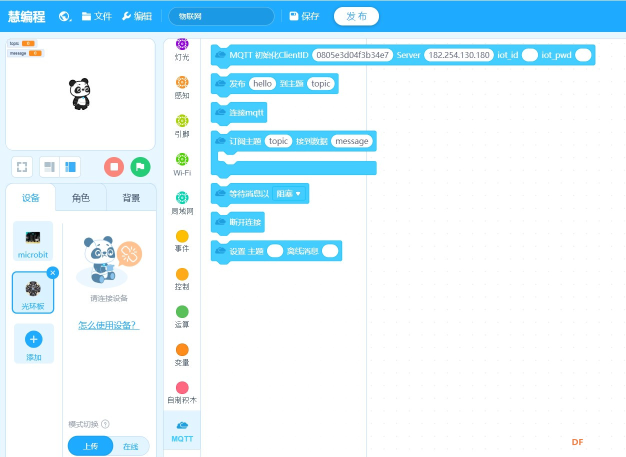 前几天在mblock为光环板写了一个MQTT的扩展,可以让光环接通过mqtt协议连接到Easyiot物联网平台,可实现发布和订阅消息。当然也可以通过物联网平台,控制其他物联网设备(eg:光环板语音控制掌控板)。