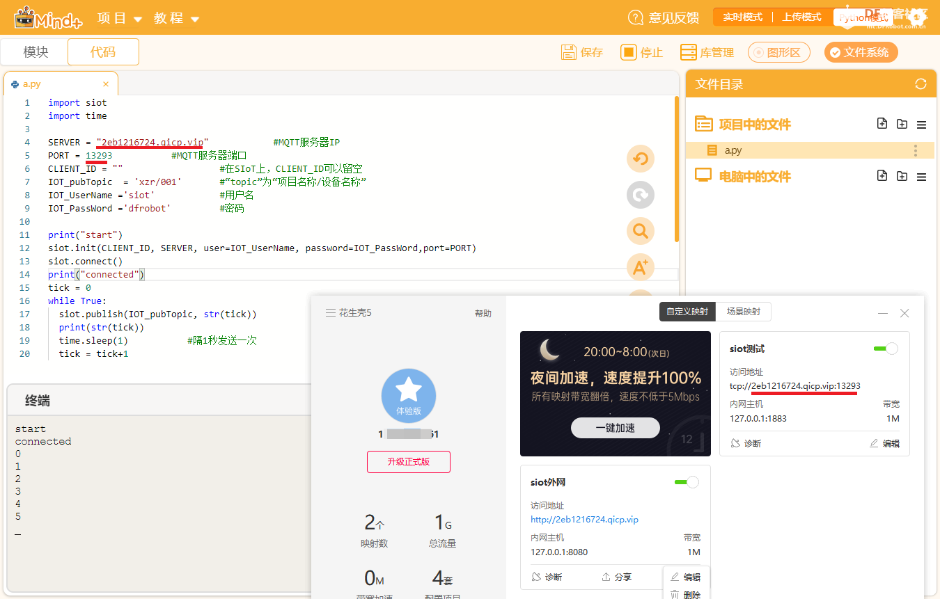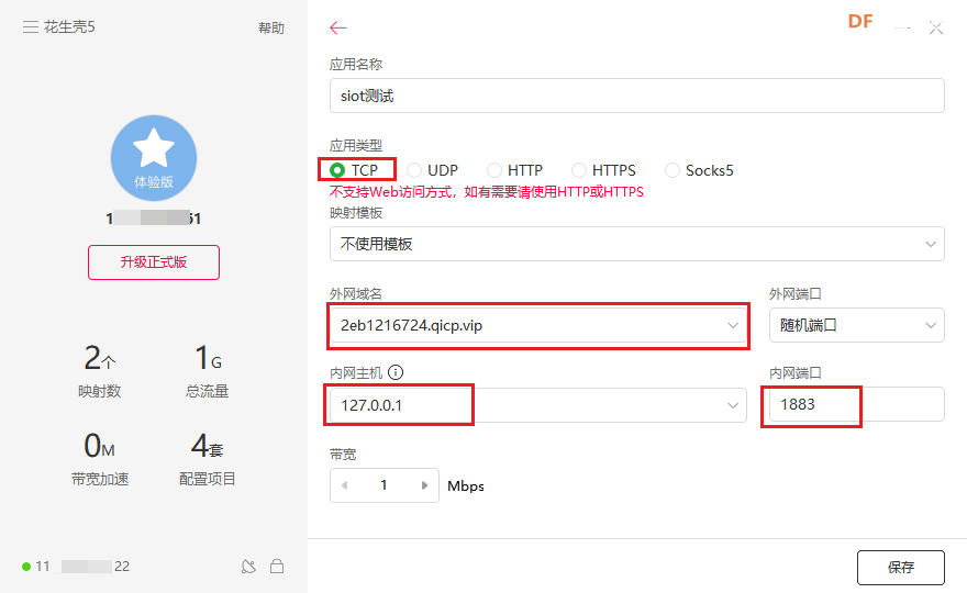 【注意(2021年):花生壳升级之后免费账号只有1个端口映射数了,可以将仅有的端口用作1883的端口,这样只能在本地查看网页数据了,或者升级花生壳付费版本开2个端口映射。】