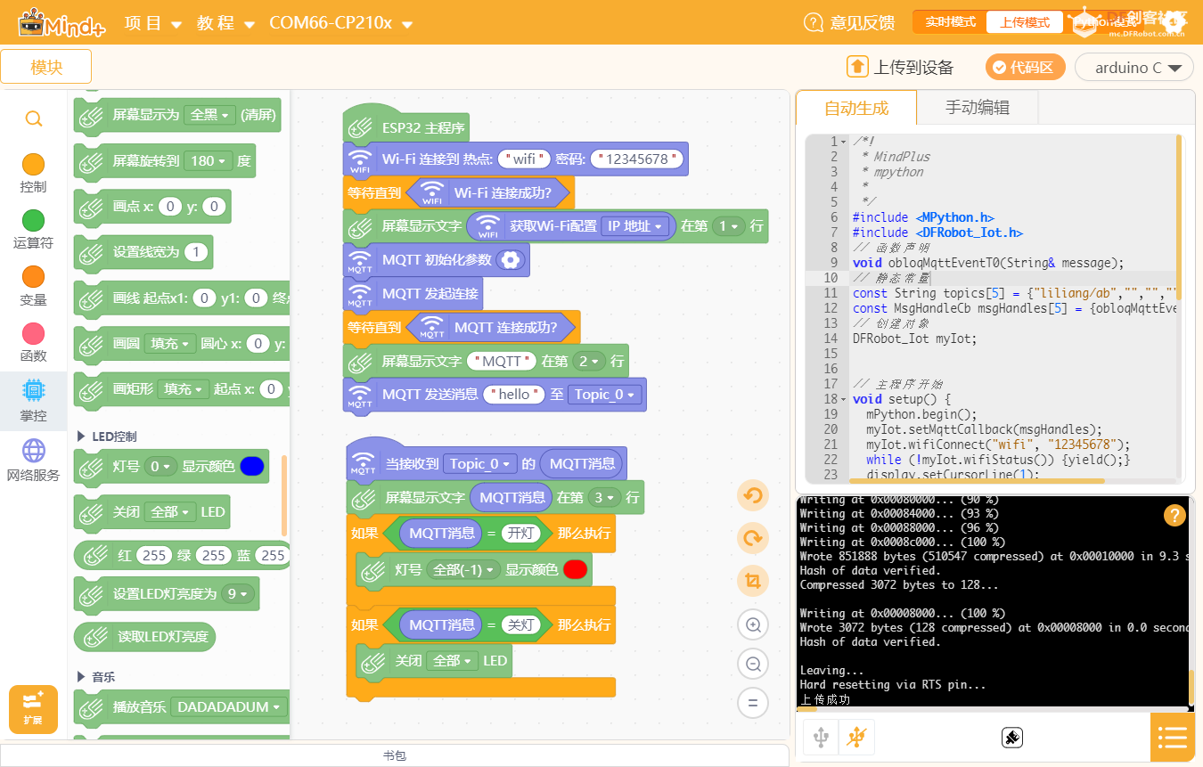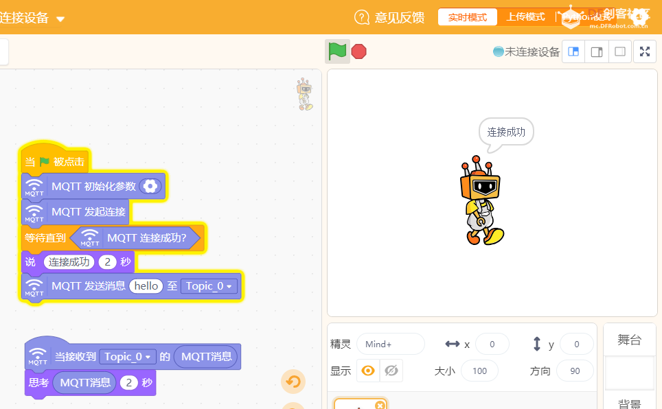 掌控板通过设置服务器地址也可以正常使用,切换到上传模式,加载WiFi和MQTT扩展,编写如下程序: